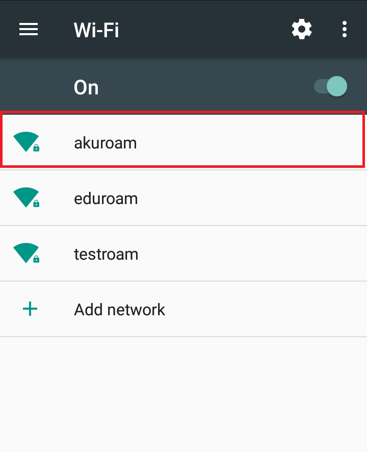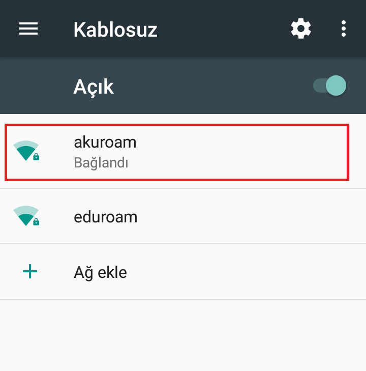 1.)Android işletim sistemli akıllı telefonlarınızdan “Ayarlar” bölümüne giriniz. Ayarlardan “Wi-Fi” Seçeneğini aktif hale getiriniz. Daha sonra “Wi-Fi” seçeneği aktif hale getirildikten sonra, resimdeki gibi gelen kablosuz ağlardan “akuroam” ağını seçiniz.
