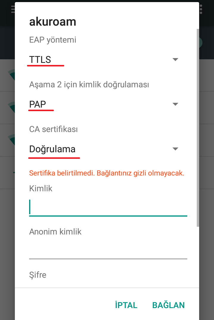 4.)Girilen bilgiler eksiksiz ve doğru ise resimdeki gibi “akuroam” ağına bağlandı yazısı yazacaktır.