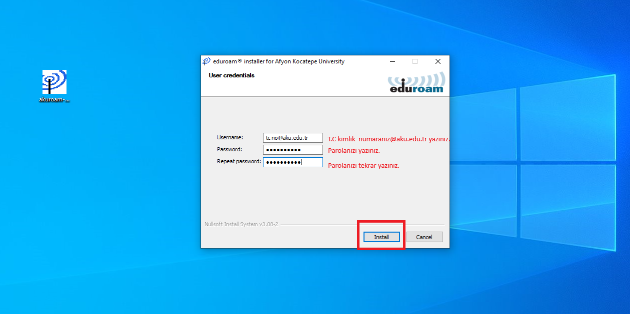 4.)Kullanıcı adı ve parola giriniz.kullanıcı adı kısmına TC kimlik numaranızı @aku.edu.tr girip Install tıklayınız.